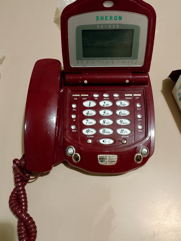 SHERON masaüstü telefon, koyu bordo renkte ve ekranlı kapaklıdır, tuşlu klavye ve spiral kablolu ahizesi bulunur. Arayan numarayı gösterme saat,ay özellikli temiz ve kısa süre kullanılmıştır