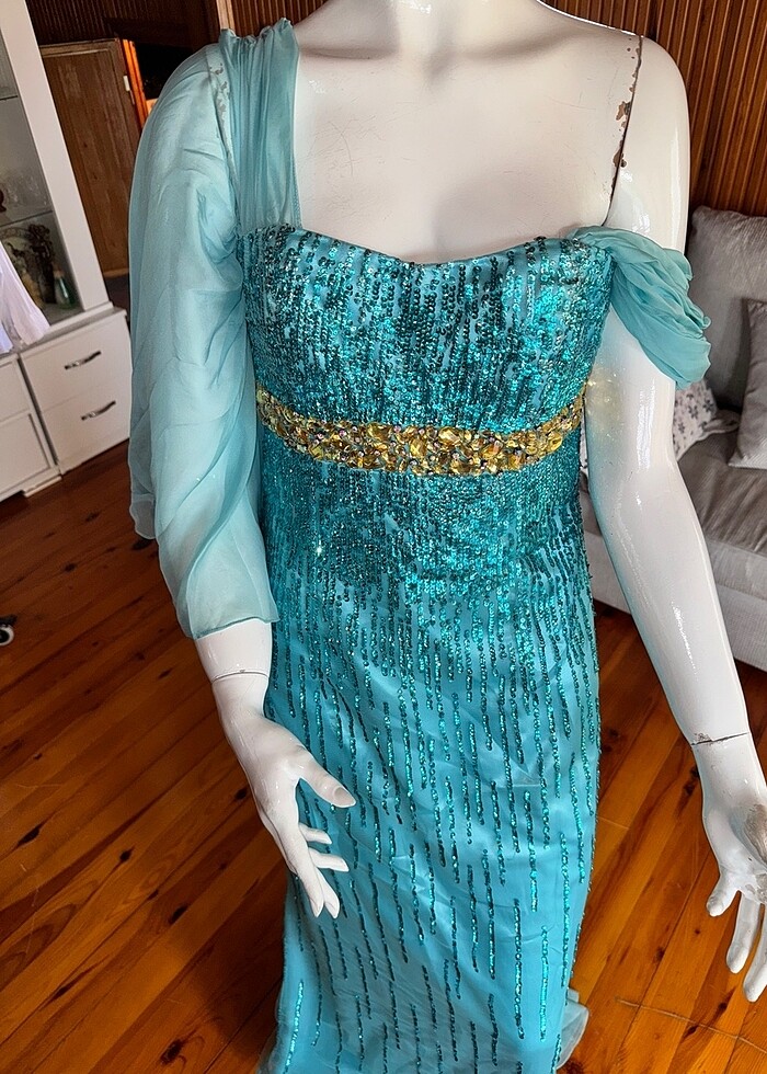 S beden pul ve gold taş işlemeli tasarım abiye. İsterseniz tülünü çıkarıp straplez olarak kullanabilirsiniz. Hiç giyilmedi.