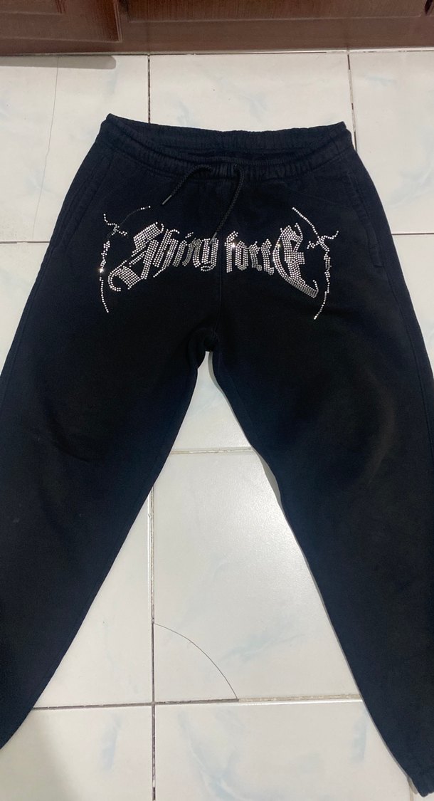 Siyah renkli, payetli "Shiny force" baskılı, sentetik kumaştan yapılmış bol kesim eşofman altı. Normal boyda, spor ve rock punk tarzına uygun.
