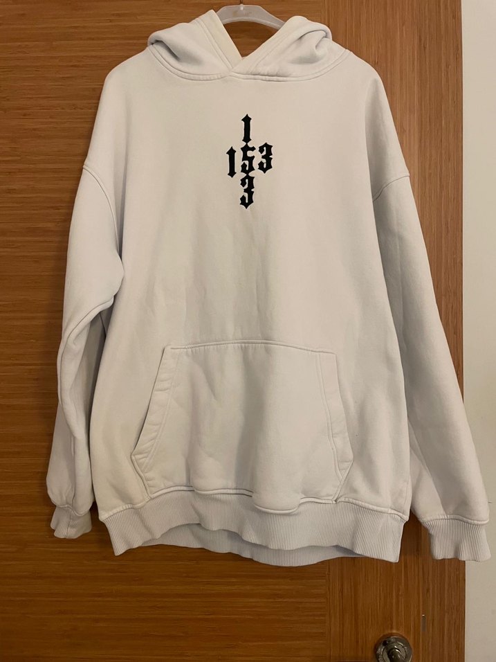 Beyaz, uzun kollu, kapüşonlu sweatshirt. Önünde baskılı desen ve rahat kesimiyle günlük kullanıma uygun, yumuşak kumaştan üretilmiştir.