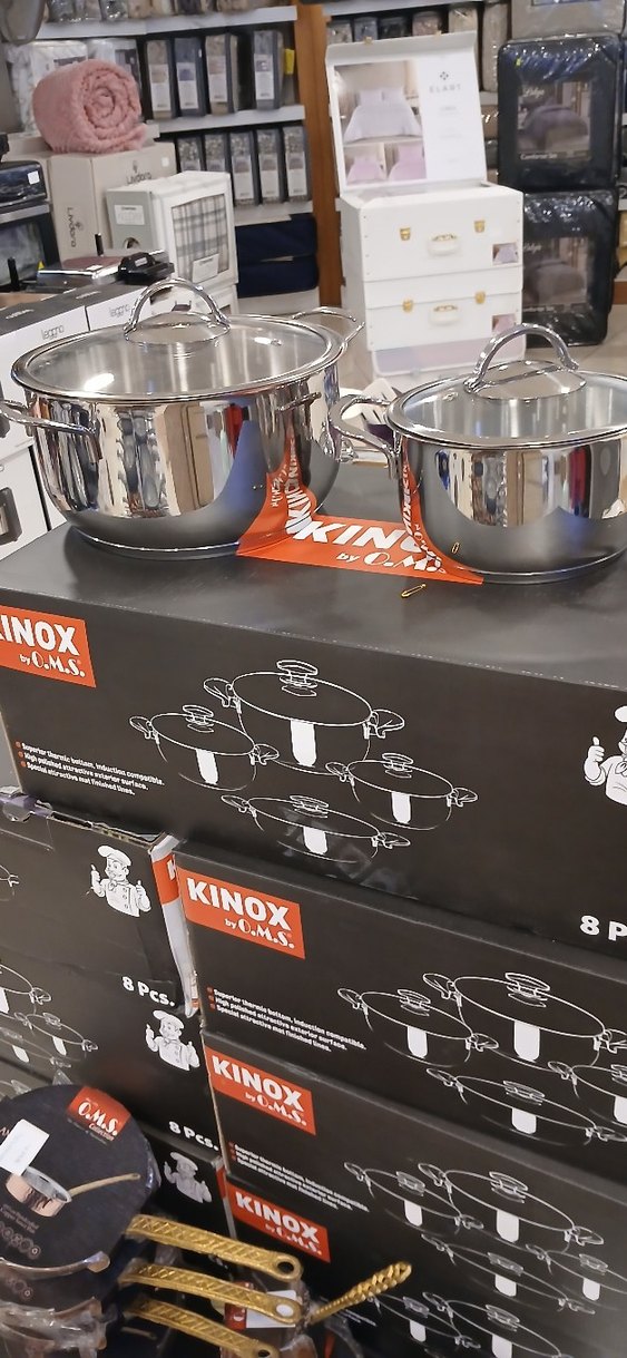 Parlak paslanmaz çelikten üretilmiş, cam kapaklı ve sağlam saplı 8 parçalık tencere seti. KINOX markalıdır.
