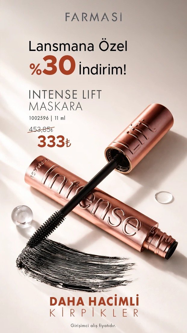 Parlak siyah renkte Intense Lift maskara, hacimlendirme etkisiyle 11 ml tüpte sunulur. Lansmana özel %30 indirim fırsatıyla.