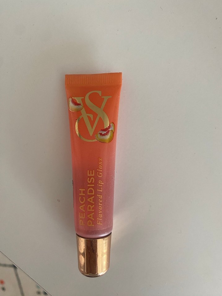 Shiny turuncu dudak parlatıcısı, şeftali desenli ve altın kapaklı, dudaklara canlı parlaklık katıyor .