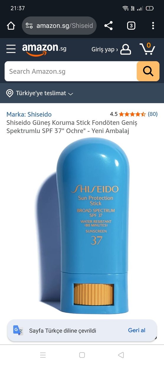 Shiseido Güneş Koruma Stick, SPF 37 geniş spektrum koruma sağlar. 80 dakika suya dayanıklı, kolay uygulanan stick formda güneş koruması sunar.