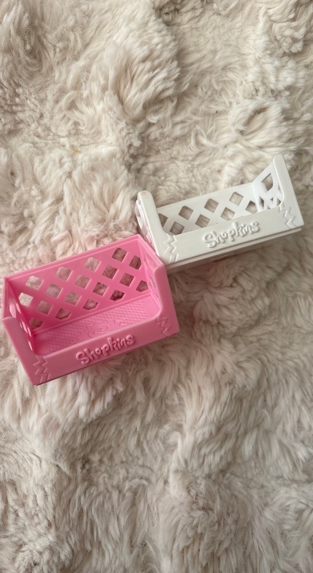 Pastel pembe ve beyaz renklerde, dayanıklı plastikten yapılmış Shopkins bebek beşikleri, kafes desenli tasarım içerir.