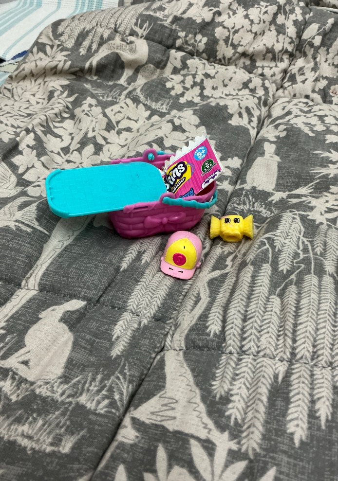 Pembe sepet ve mavi kapaklı, renkli mini oyuncak seti. Küçük oyuncak aksesuarları içerir.