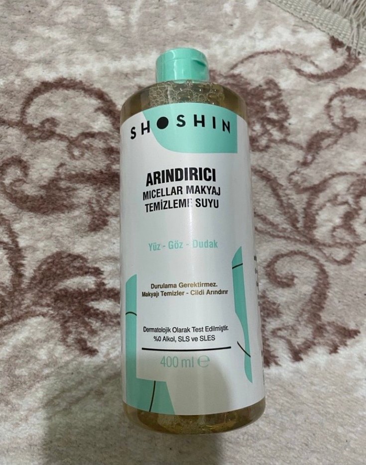 Shoshin micellar makyaj temizleme suyu, yüz, göz ve dudakları durulamaya gerek kalmadan temizler. Dermatolojik olarak test edilmiştir, alkol, SLS ve SLES içermez. 400 ml