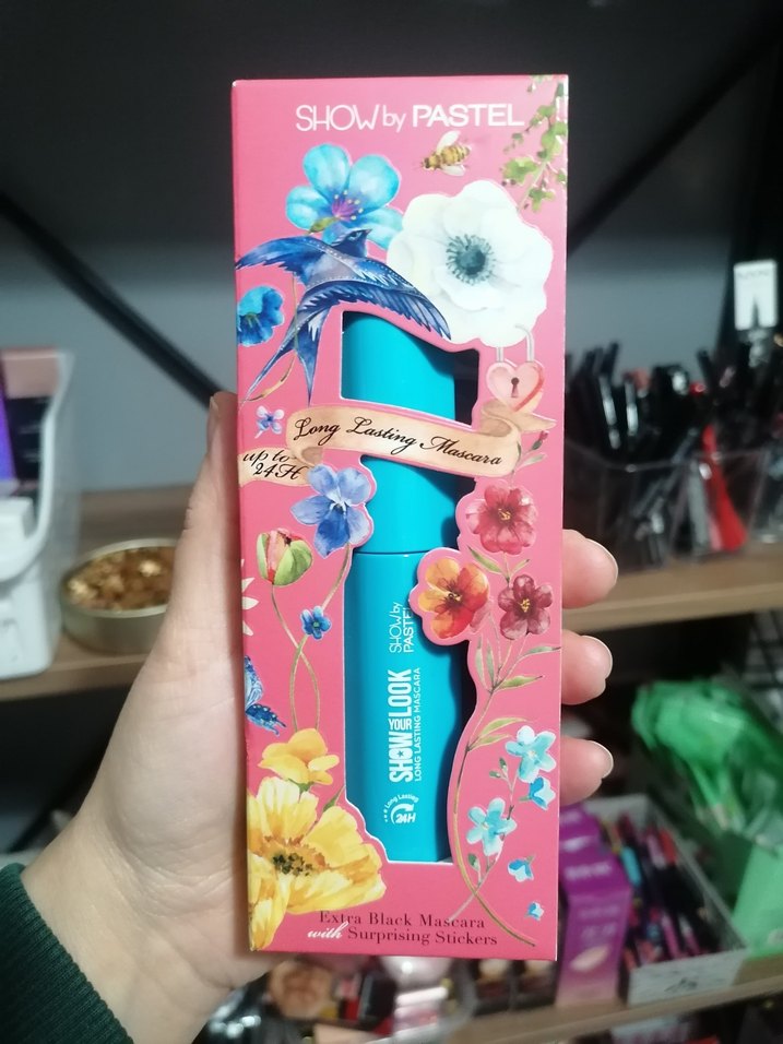 SHOW by Pastel çok renkli maskara, uzun süre kalıcı formüllü. Ambalajda çiçek desenleri ve mavi maskara tüpü bulunur.
