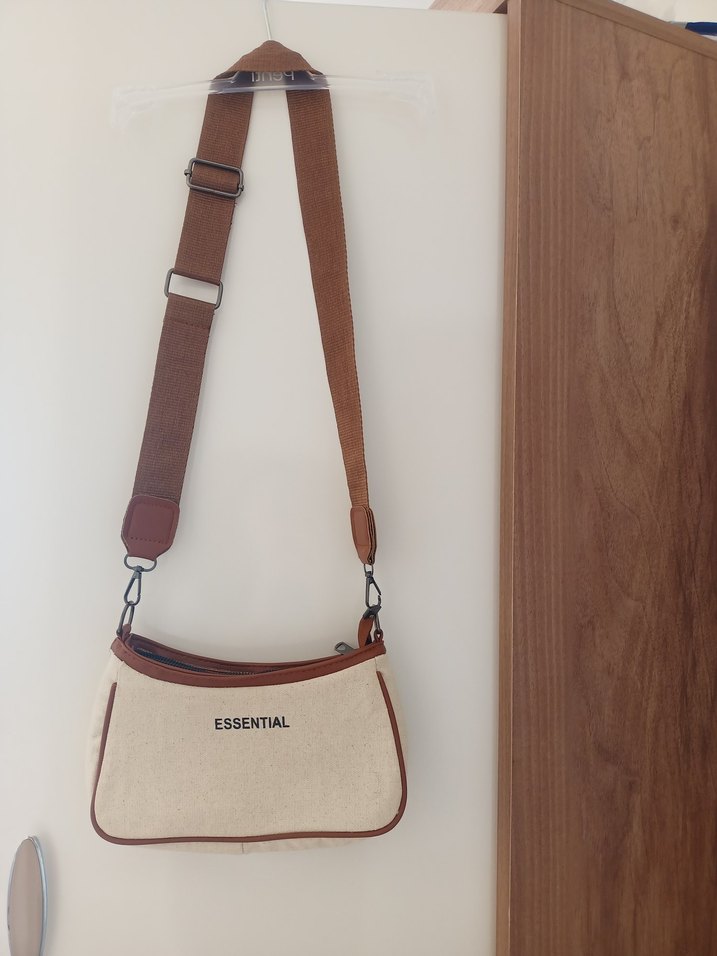 Bej süet malzemeden üretilmiş, ESSENTIAL baskılı ve ayarlanabilir kahverengi askılı kadın çantası. Rahat ve şık bir görünüm sunar.