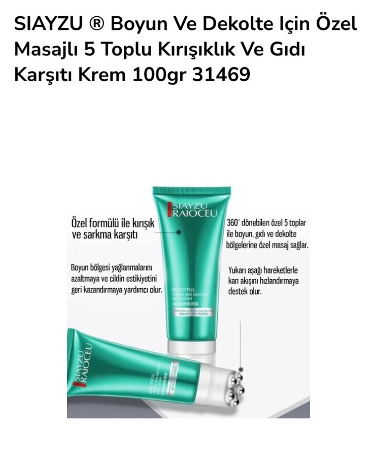 SIAYZU krem, 5 masaj topu ile boyun ve dekolte bölgesindeki kırışıklık ve sarkmayı hedefler. Cilt elastikiyetini destekler, kan akışını hızlandırır.