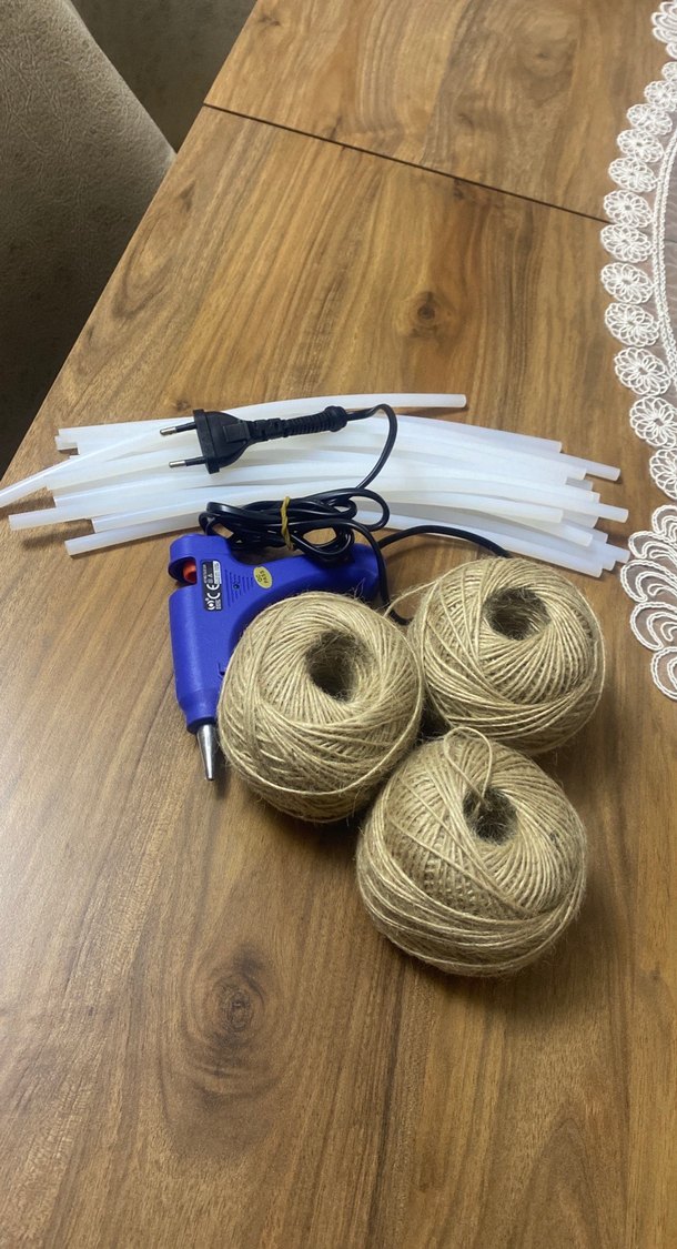 Mavi sıcak tutkal tabancası, güç kablosu, birkaç tutkal çubuğu ve üç bej ip topu içeren hobi seti.