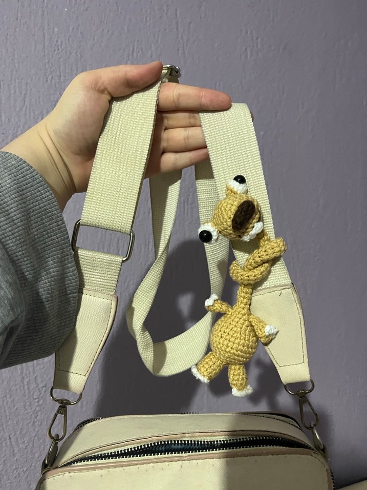 Açık camel renginde, küçük bir hayvan şeklinde peluş oyuncak. Bej çanta kayışına bağlı, yumuşak dokulu ve sevimli tasarımlı.