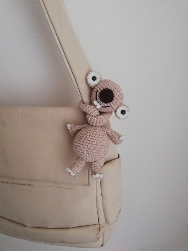 Büyük gözlü, yumuşak ve sevimli bej örgü peluş oyuncak, dekorasyon veya oyun için uygun .