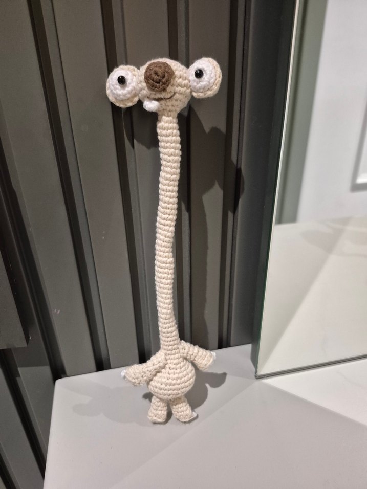 Bej renkte, uzun boyunlu ve büyük gözlü, yumuşaksid telsiz amigurumi sifir örme kumaştan yapılmış peluş oyuncak. Eğlenceli ve benzersiz tasarıma sahip.