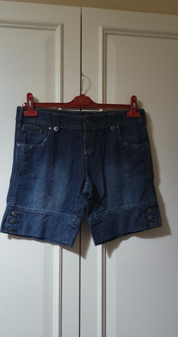 Düğmeli, bol kesim, koyu mavi kadın denim şort. Bel ve paçada düğme detayları bulunur. Rahat ve sokak stiline uygun outdoor şort.