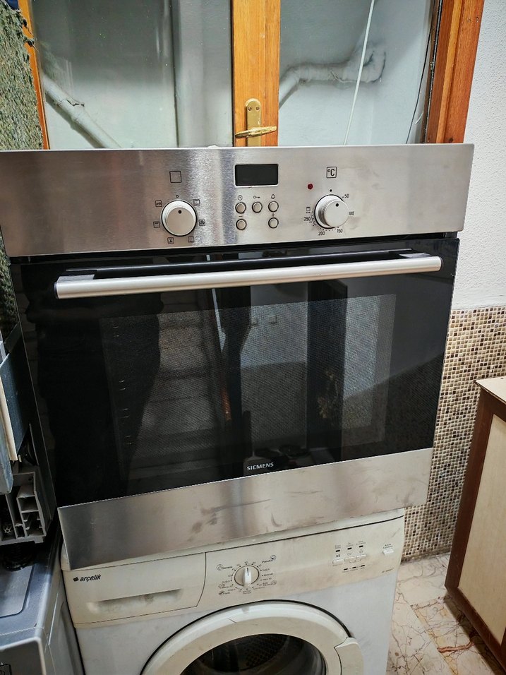 Siemens gri ankastre fırın, dijital ekran ve manuel kontrol düğmeleri ile hassas ayar sağlar. Geniş cam kapak ve dayanıklı kulp bulunur.