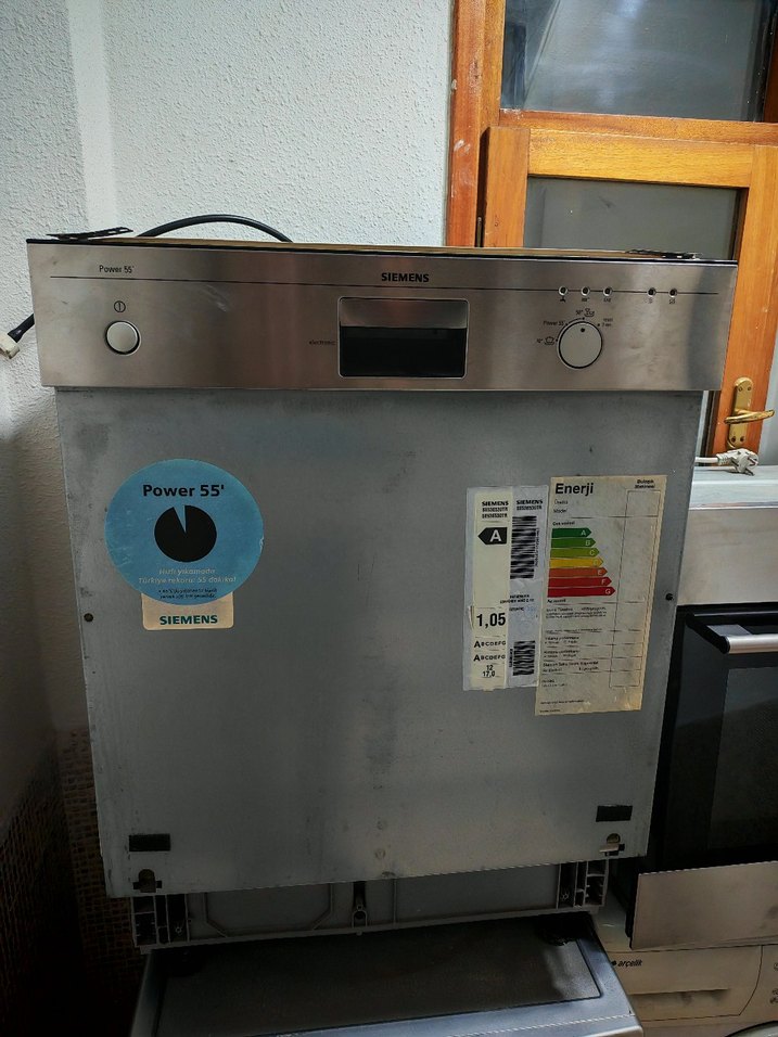 Siemens bulaşık makinesi gri renkte olup, dijital ekran ve kontrol düğmelerine sahiptir. Enerji etiketi ve Power 55 etiketi bulunmaktadır.