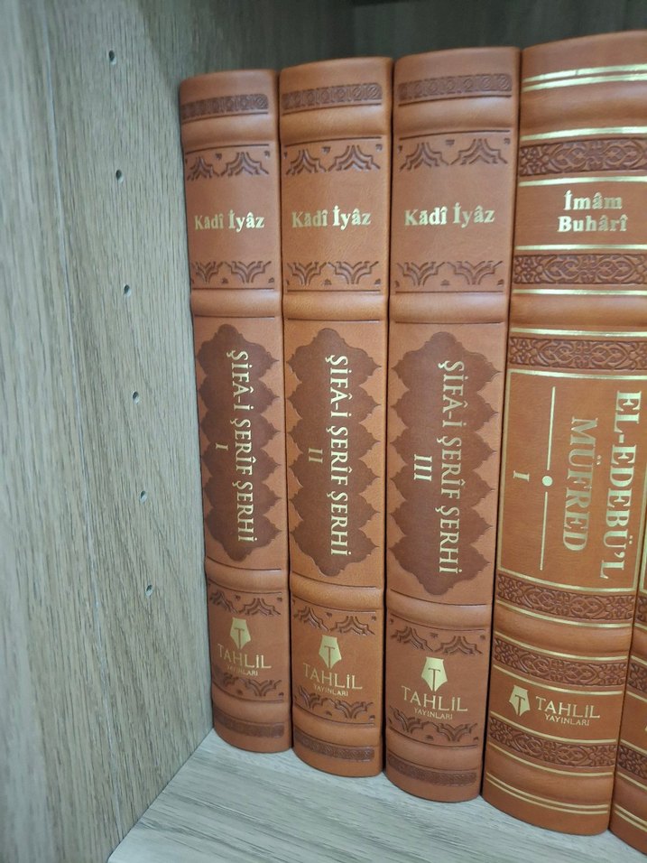 Kadı İyaz tarafından yazılmış, kahverengi kapaklı, kabartmalı detaylara sahip üç ciltlik Şifa-i Şerif Şerhi seti. Dini yorumlar ve klasik İslami metinler içerir.