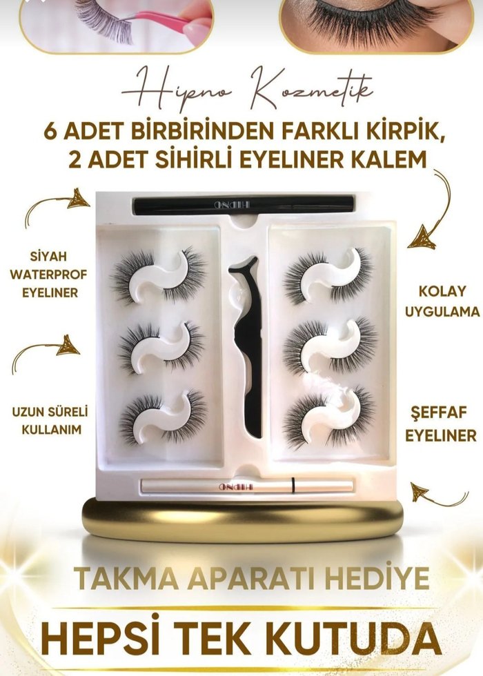 6 farklı takma kirpik, siyah ve şeffaf suya dayanıklı 2 sihirli eyeliner ile kolay uygulama aparatı içeren uzun süreli kullanım seti. ✨ Sıfır kutulu ürün.