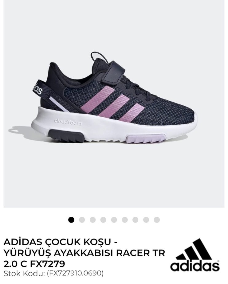 Adidas kız çocuk spor ayakkabısı, lacivert bağcıksız ve cırt cırtlı, kauçuk tabanlıdır. Hiç giyilmedi. Rahatlık ve şıklık sağlayan cloudfoam yastıklamaya sahiptir.
