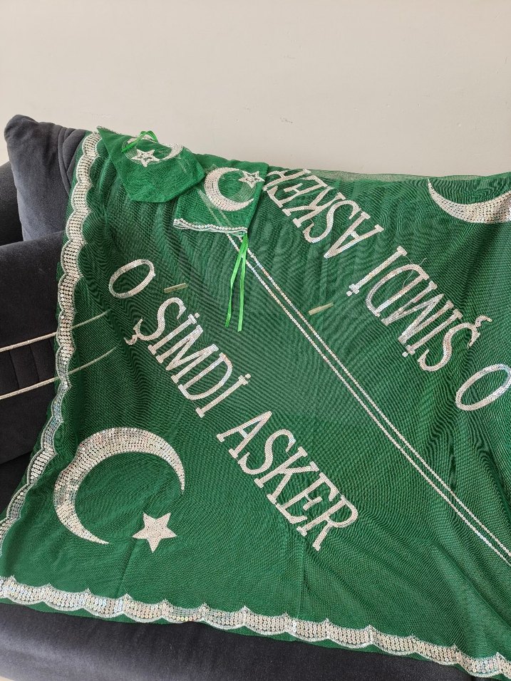 Yeşil parlak renkte, "SIMDI ASKER" yazılı ve hilal-yıldız desenli ASKER ORTUSU
