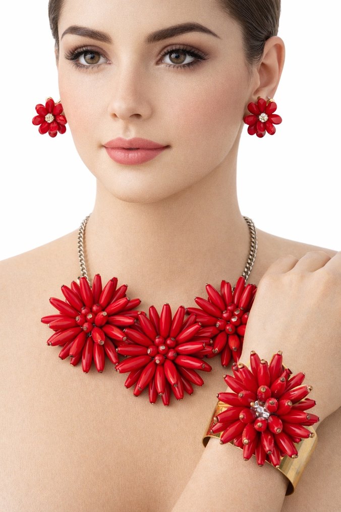Sıfır Ayarında Kırmızı Çiçek Takı Seti Kolye-Küpe-Bilezik