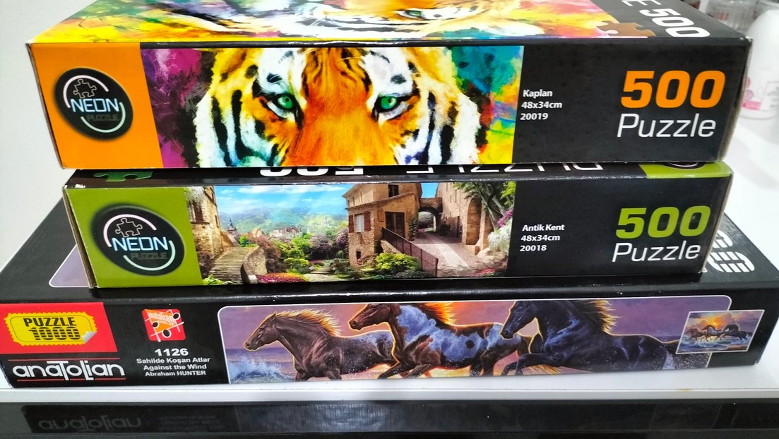 Koleksiyonumdaki titizlikle baktığım 3 adet puzzle’ı toplu set olarak satıyorum. Hepsi sadece bir kez yapılmış olup sıfır ayarındadır. ✅ Kondisyon: Parçalarda ve kutularda en ufak bir aşınma, yıpranma veya toz yoktur. ✅ Eksik Parça: Tüm puzzle’lar kontrol edilmiştir, %100 parça tamdır. ✅ Kayıp Parça Desteği: Anatolian markalı 1000 parçalık puzzle'ın kutusundaki kayıp parça kodu durmaktadır. Set İçeriği: Anatolian - Koşan Atlar (1000 Parça): Markanın en sevilen, kaliteli baskı modellerinden. Neon - Modern Kaplan (500 Parça): Canlı renkli ve dekoratif. Neon - Manzara / Taş Ev (500 Parça): Dinlendirici ve klasik bir model. Toplu alım olduğu için fiyatı uygun tuttum.