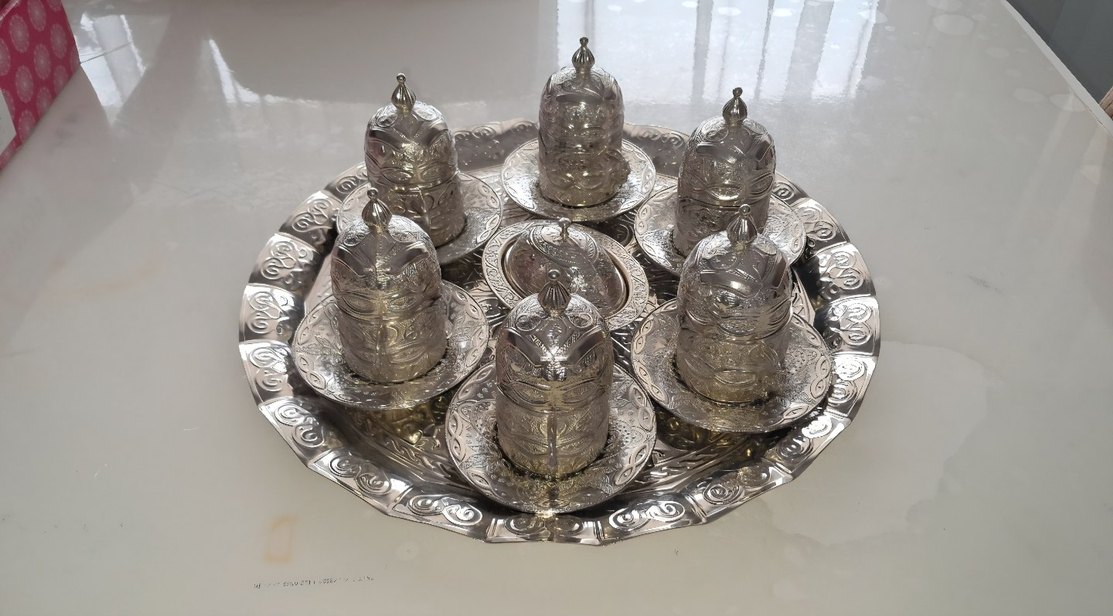 Ürun kutulu ve sifırdır. Sadece tepsisi için bile alınır Çok şık sunumlar için idealdir. Son resimde görünen imalattan kaynaklı fincan tabakalarında birinde kücük bir delik vardır. işçilik sırasında oluşmuş. kullanıma ve görsele bir etkisi yoktur