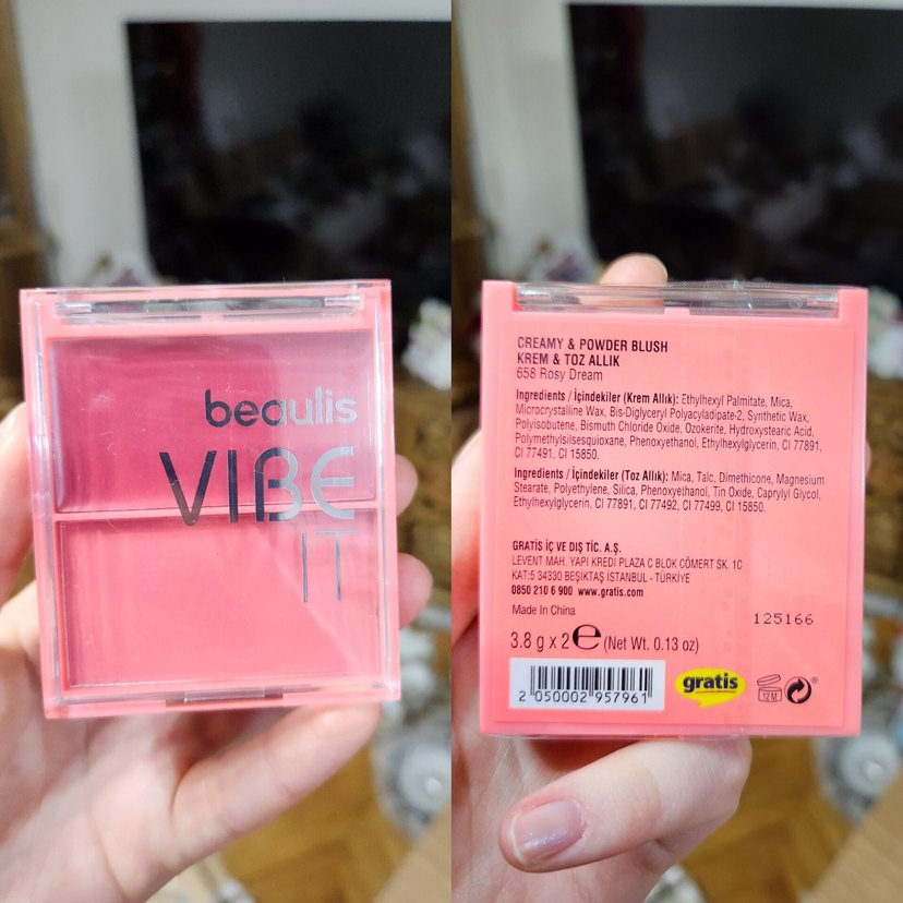 Beaulis Vibe krem ve toz allık, pastel pembe renkte, kompakt kutuda sunulmaktadır. Gratis'te mevcuttur. jelatinli