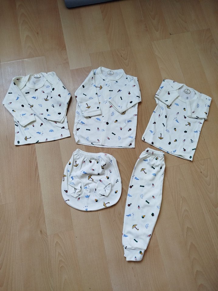 Sıfır çok kaliteli yeni doğan bebek takımı toplam 5 parça. 100 % pamuk. Yurtdışından alındı Üst boy 34 cm alt boy 40 cm. 1-3 ay