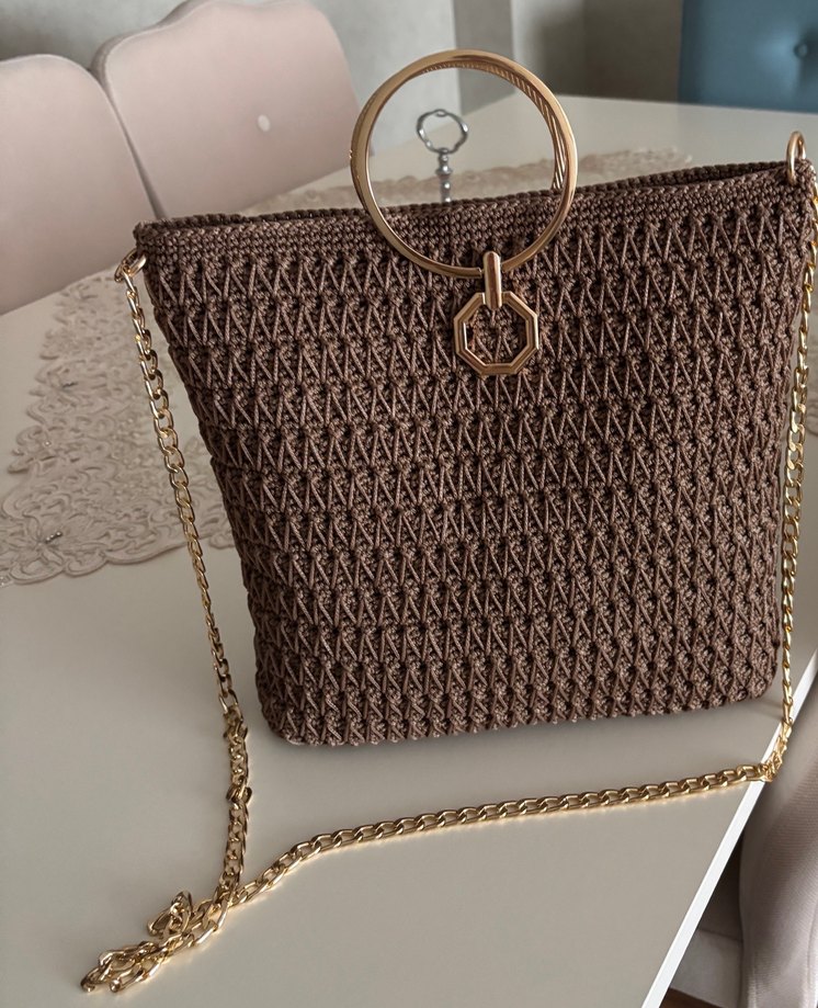 Zincir detaylı ve halka süslemeli kahverengi örgü kadın çanta. Minimalist ve bohem tarzıyla günlük kullanıma uygun, desensiz tasarım.