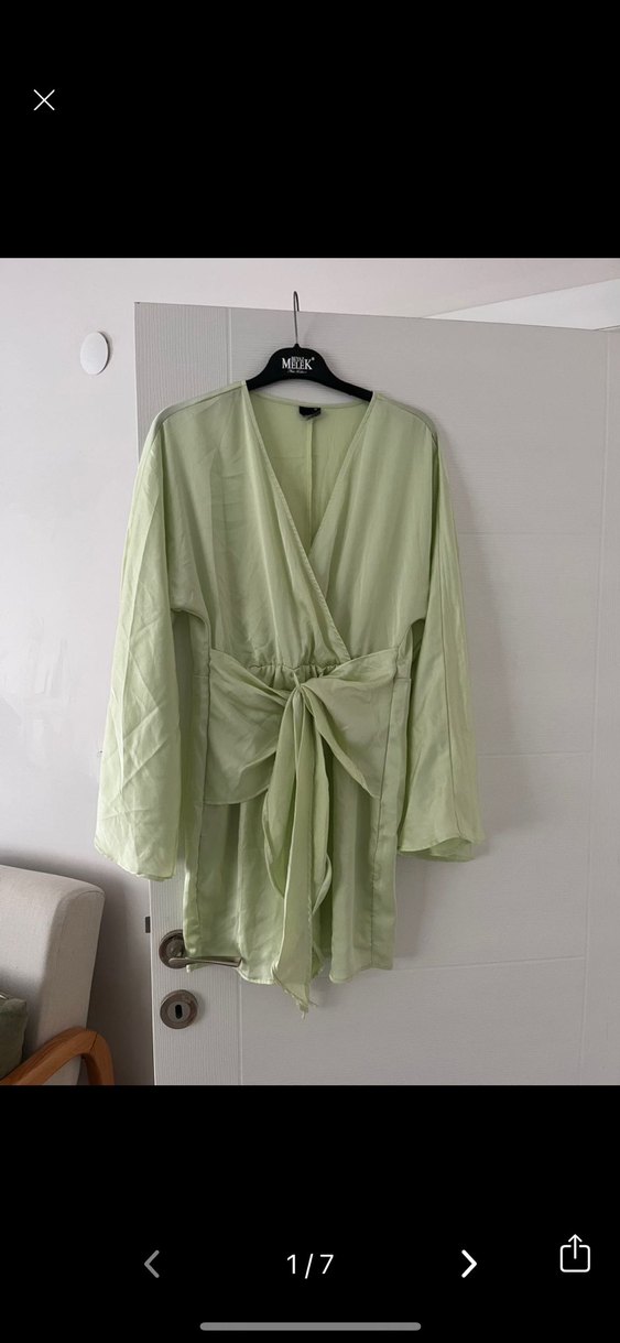 Pastel yeşil renkli, midi boyda ve uzun kollu kadın elbisesi. Salaş kesim, minimal ve deseniz tasarım, belde bağlama detayı bulunur.