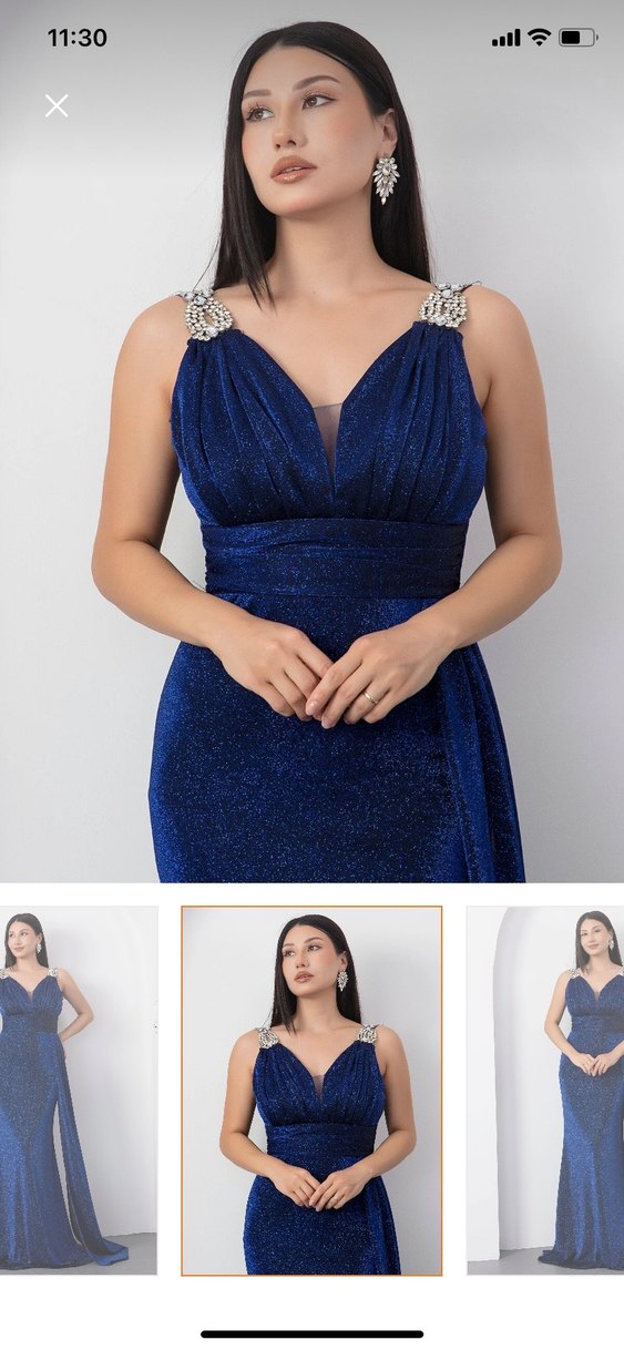 Lacivert, V yakalı, drapeli detaylı, midi boy, ince oturan abiye elbise. Kolsuz, parlak kumaş ve süslü omuz aksesuarlarıyla düğünler için uygun.