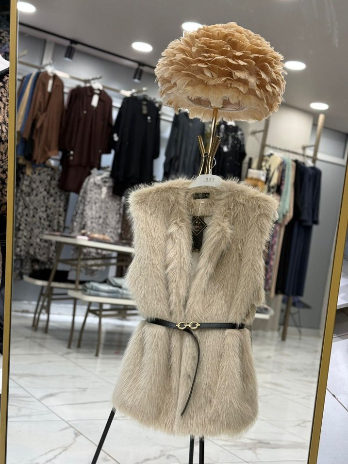 Sıfır Etiketli Lüks Kürk Yelek Kemerli Model Krem