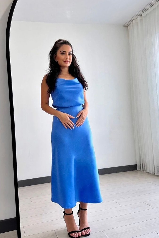 Ürün sıfır, etiketi üzerinde Hiç giyilmedi. Şık davetlerde, doğum günlerinde, mezuniyetlerde veya özel gecelerde kullanılabilecek çok zarif bir modeldir. Hafif parlak saten dokusu ve dökümlü detayı ile vücuda tam oturur. Beden: S Renk: Mavi Kumaş: Saten Kargo aynı gün gönderilir
