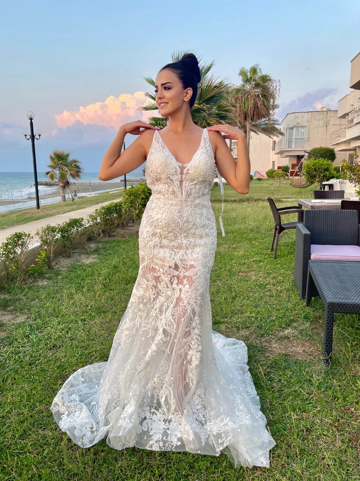Bu uzun beyaz gelinlik, V yaka ve askılı kol detayıyla klasik zarafet ve bohem şıklığı bir araya getiriyor. İnce kesimli A-line modeliyle dikkat çekiyor. Sıfır gelinlik