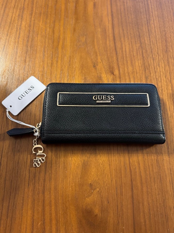 Guess marka, parlak siyah deri ve fermuarlı kapama özellikli kadın cüzdanı. Modern klasik tarzda, iş şıklığını yansıtır. Günlük kullanıma uygundur.