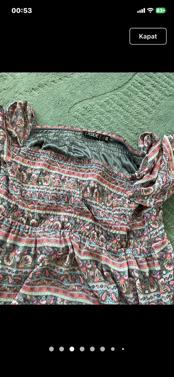 Bol kesim, tekne yaka ve kısa kollu bluzu. Bohem desenli tekstil ve fırfır detayları bulunur. Uzun boyu ve çok renkli gri tonları günlük kullanıma uygundur.