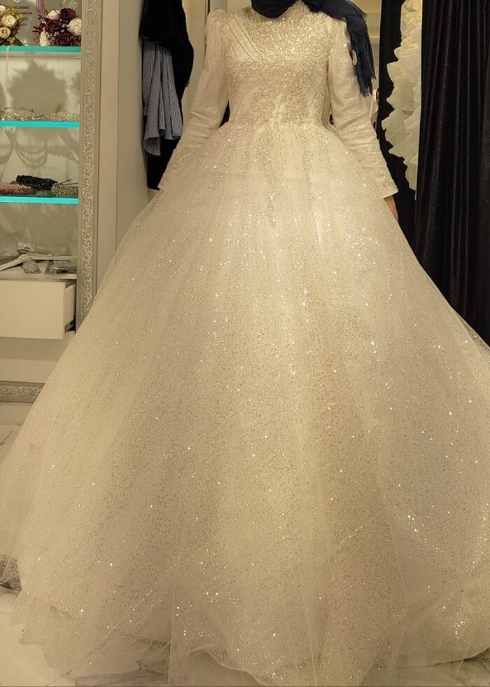 Satın aldım ama hiç giymedim.36 38 beden uyumlu arkası ipli.alt kısmı simli harika prenses model gelinlik