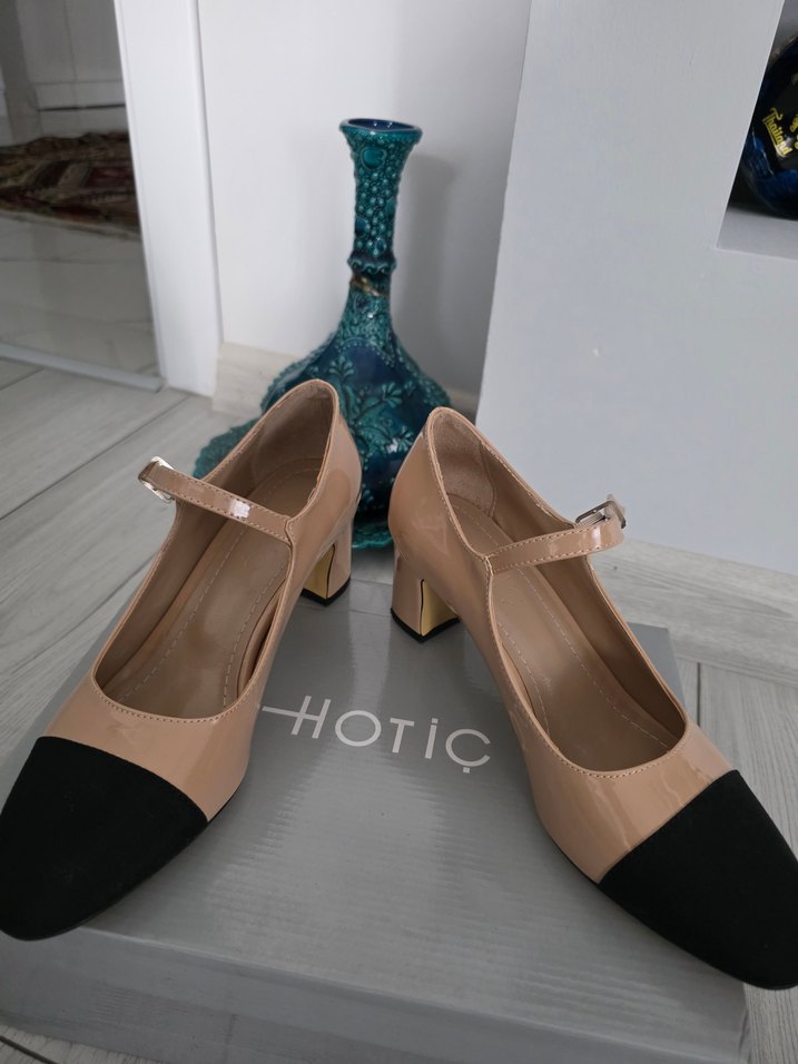 Sıfır Hotiç Bej renkli, tokalı bantlı kadın topuklu klasik ayakkabı. Yumuşak kauçuk taban ve pastel, desensiz tasarım ile ofis stiline uygun.topuk boyu 5 cm
