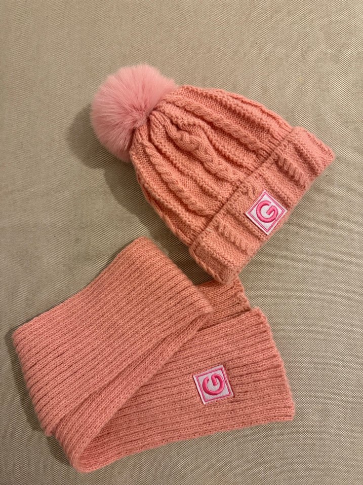 Sıfır İçi kürklü Pembe Örgü Çocuk Bere ve Atkı Seti