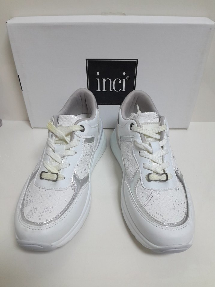İnci markasına ait beyaz yılan desenli, bağcıklı ve topuklu spor ayakkabı. Spor tabanlı, şık ve rahat tasarım. iç uzunluk 24.6 cm