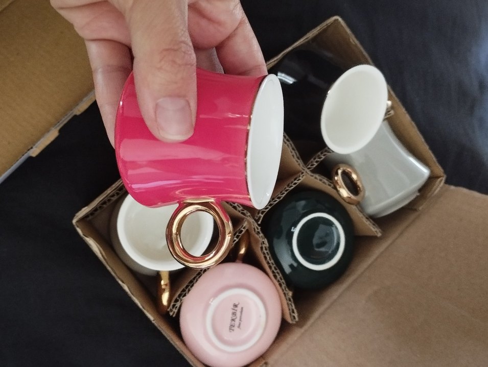 marka temsili,parlak altın kulplu, pembe renkli kahve fincanı. İç kısmı beyaz, şık ve renkli bir tasarıma sahip. ☕