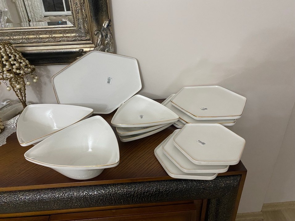 Beyaz renkli, üçgen ve altıgen şekilli tabaklar, çeşitli yemeklerin sunumuna uygun sade tasarım. Masanızı şık gösterir. ️