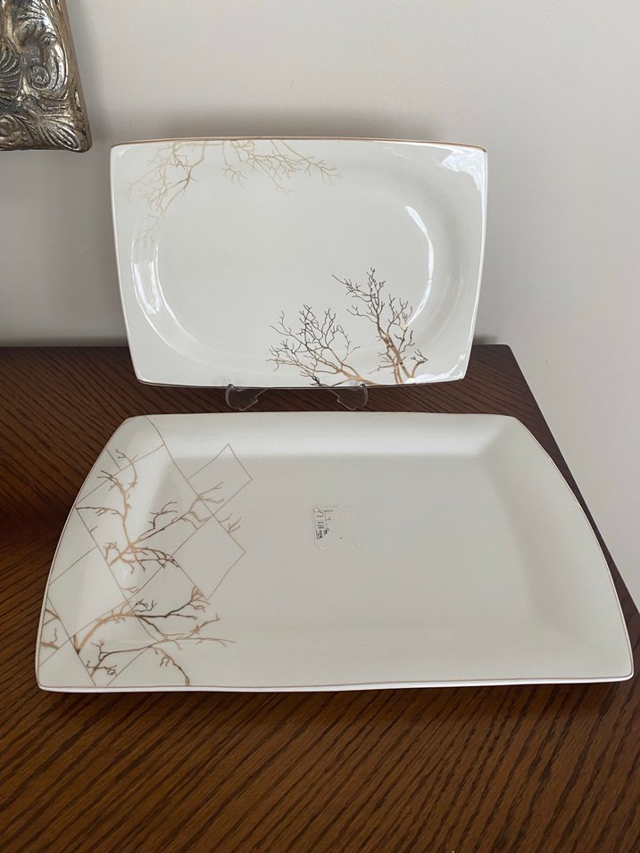 Beyaz parlak yüzeye sahip, zarif dal desenleriyle süslenmiş yemek tabakları seti.