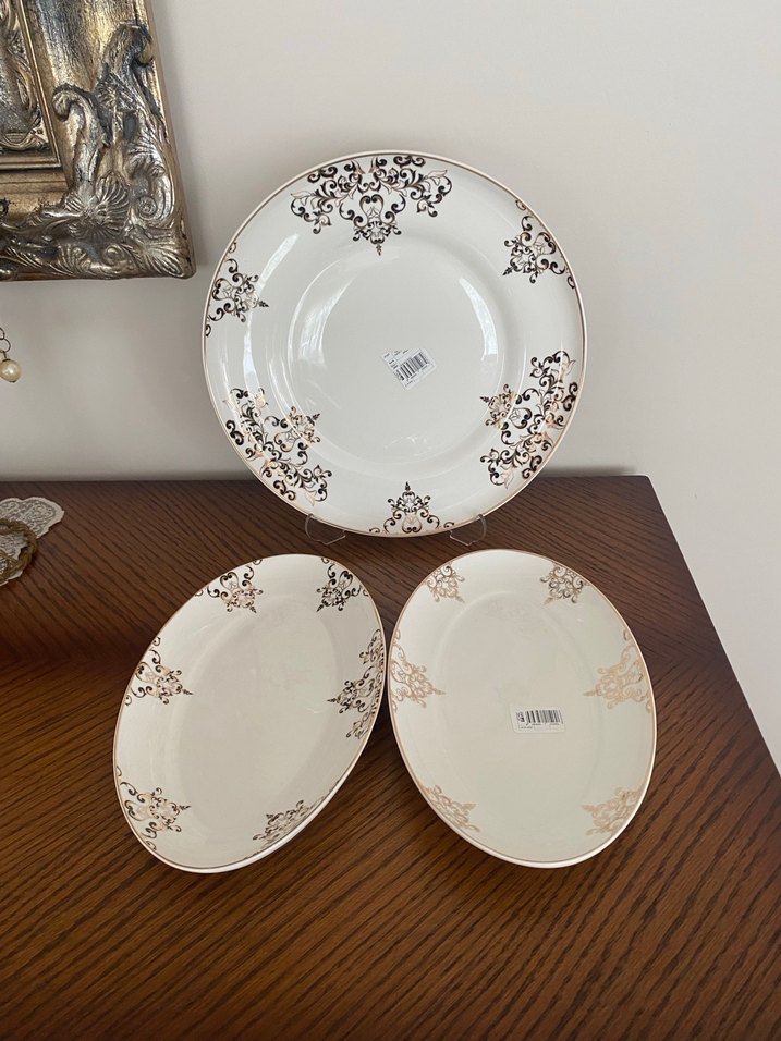 Beyaz porselenden yapılmış, koyu desenli dekoratif bir yuvarlak ve iki oval tabak seti. ️