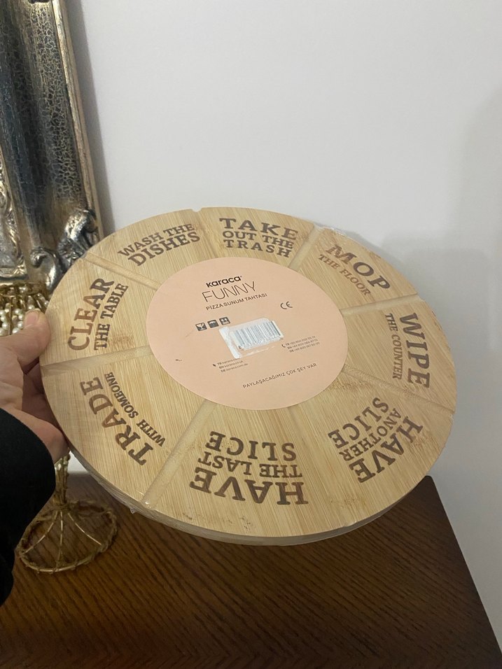 Yuvarlak bambu sunum tahtası, üzerinde komik yazılarla pizza sunumu için uygundur.