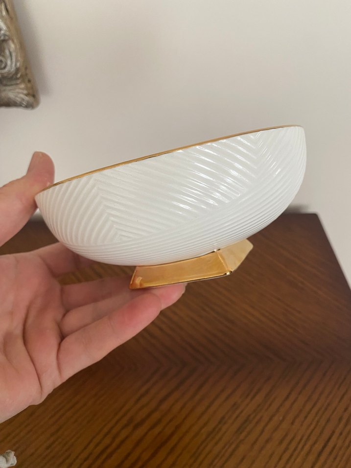 Modern klasik tarzda, altın renkli tabanlı ve hafif dokulu yüzeye sahip beyaz desensiz kase. ️