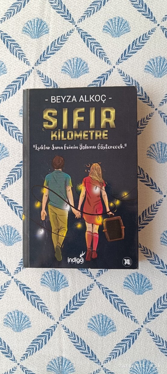 Beyza Alkoç'un "Sıfır Kilometre" adlı romanı. Kitapta isim olarak mavi yazıyo görseldeki gibi. Kitap ciltsiz ve ayraçsız