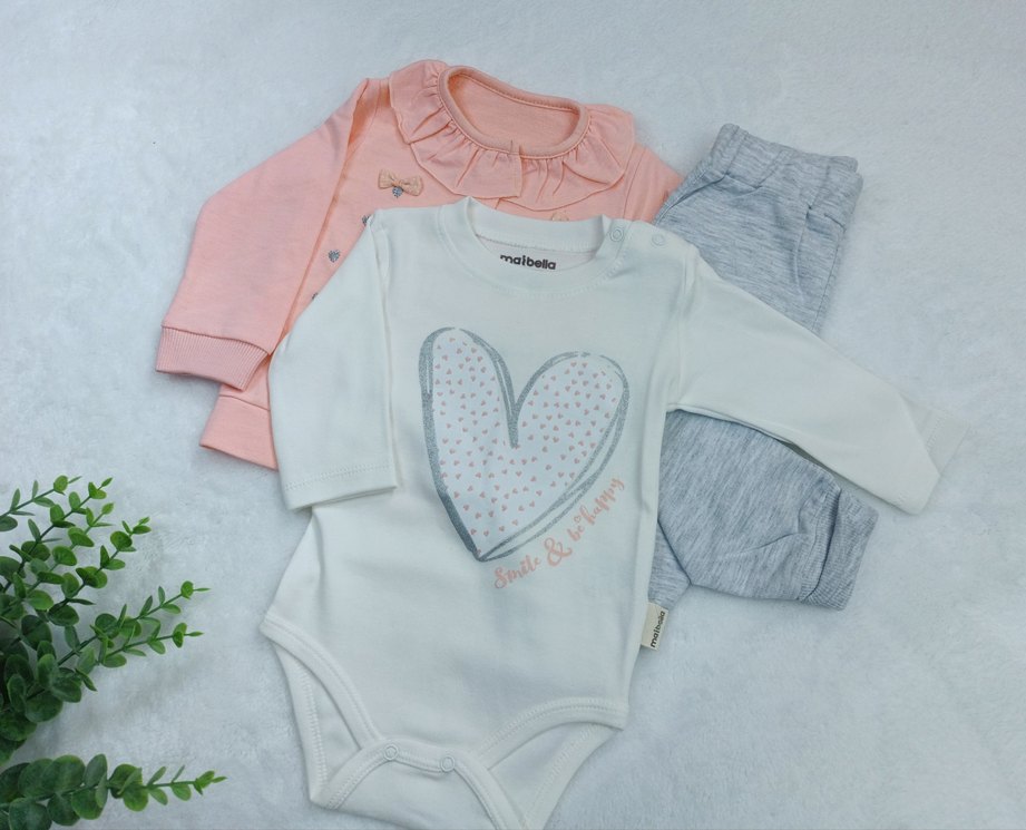 Sıfır – Hiç kullanılmamış Şık somon pembe fiyonklu hırka Kalpli beyaz zıbın (Smile & Be Happy baskılı) Rahat gri alt ✨ %100 pamuk, yumuşacık ve kaliteli kumaş Tatlı kız bebekler için hem günlük hem özel günlerde kullanılabilir Yaş aralığı: 0–12 ay